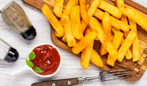 mit Salat, Gurken, Tomaten, Schmelzkäse, gehacktem Chili, Ketchup und pommes