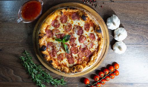mit Pizzablockschinken, Salami, Zwiebeln und Fleischsauce